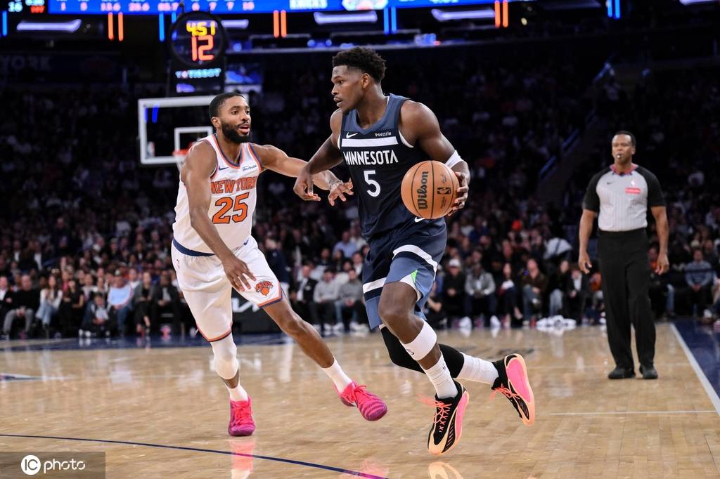 森林狼队首发:安东尼-爱德华兹、朱利叶斯-兰德尔、贾登-麦克丹尼尔斯、鲁迪-戈贝尔、丹特-迪文琴佐